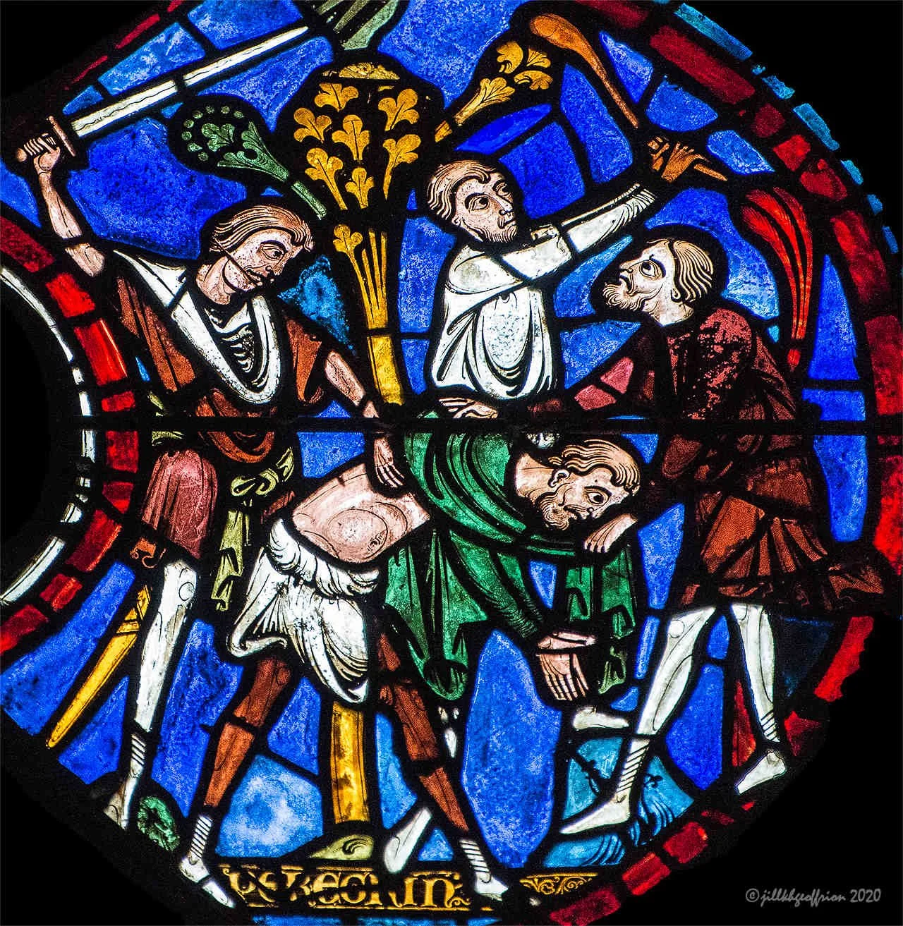 Robbers beating the pilgrim (Good Samaritan window, Chartres Cathedral, France)