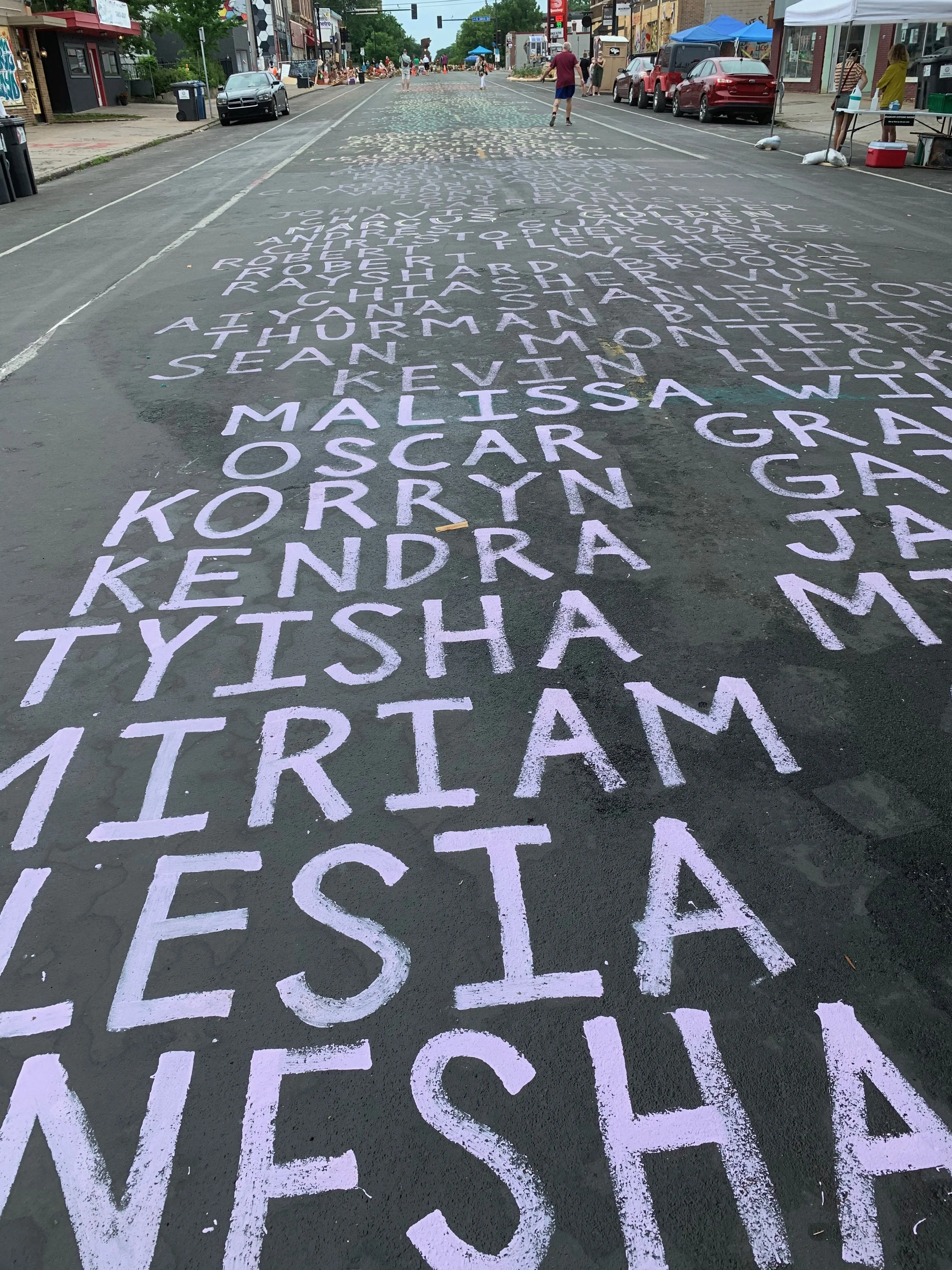 Just to the north of where George died, well over a hundred names are painted in multi-colors on Chicago Avenue, memorials to black people who have died at the hands of police in recent years. George’s killing by a white policeman wasn’t the first time. Though such killings are relatively rare (according to statistics), what happened to him has happened to others. And the perception (rightly or not) of police bullying and brutal treatment was widespread enough to strike a nerve in urban communities across the country.
